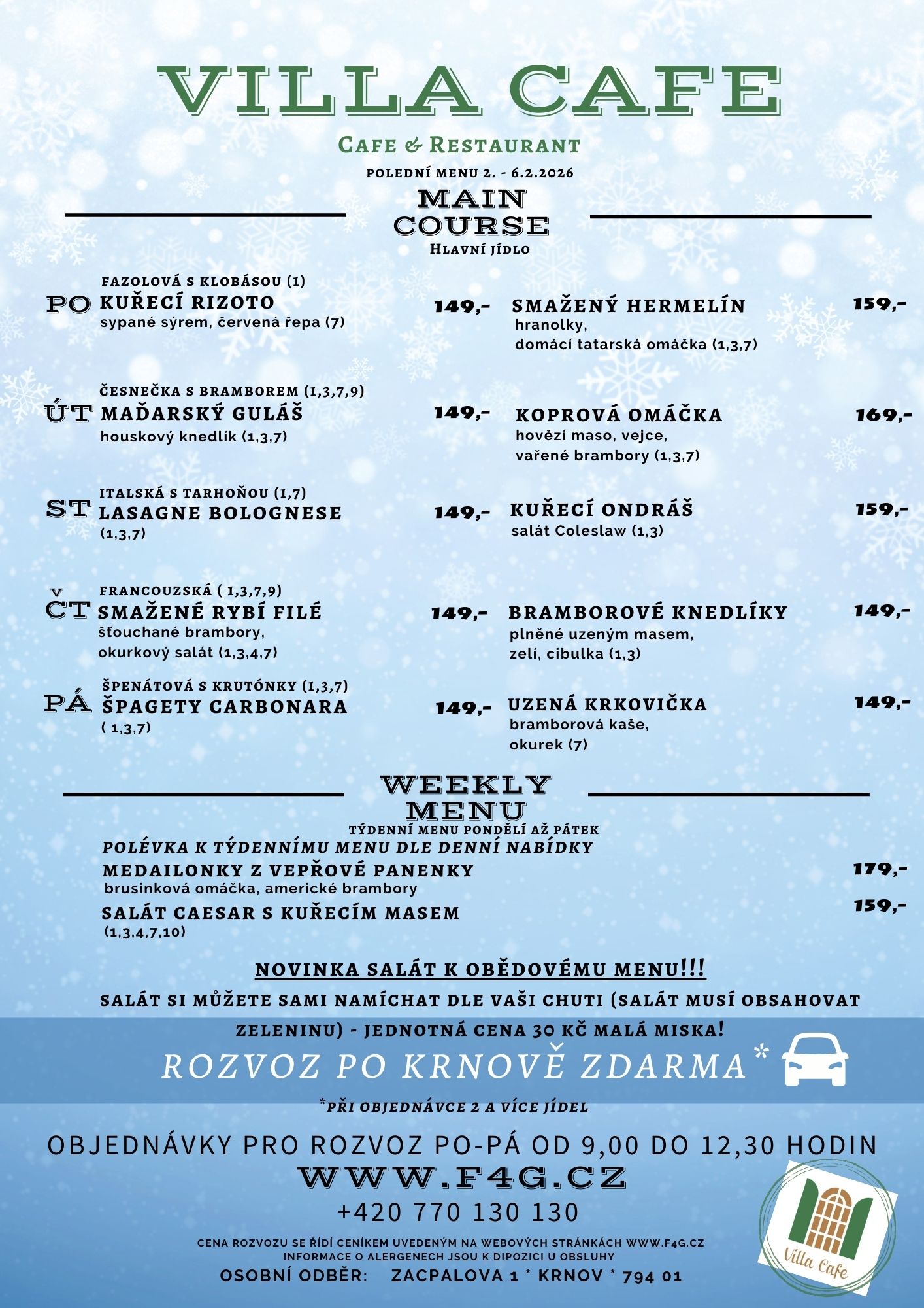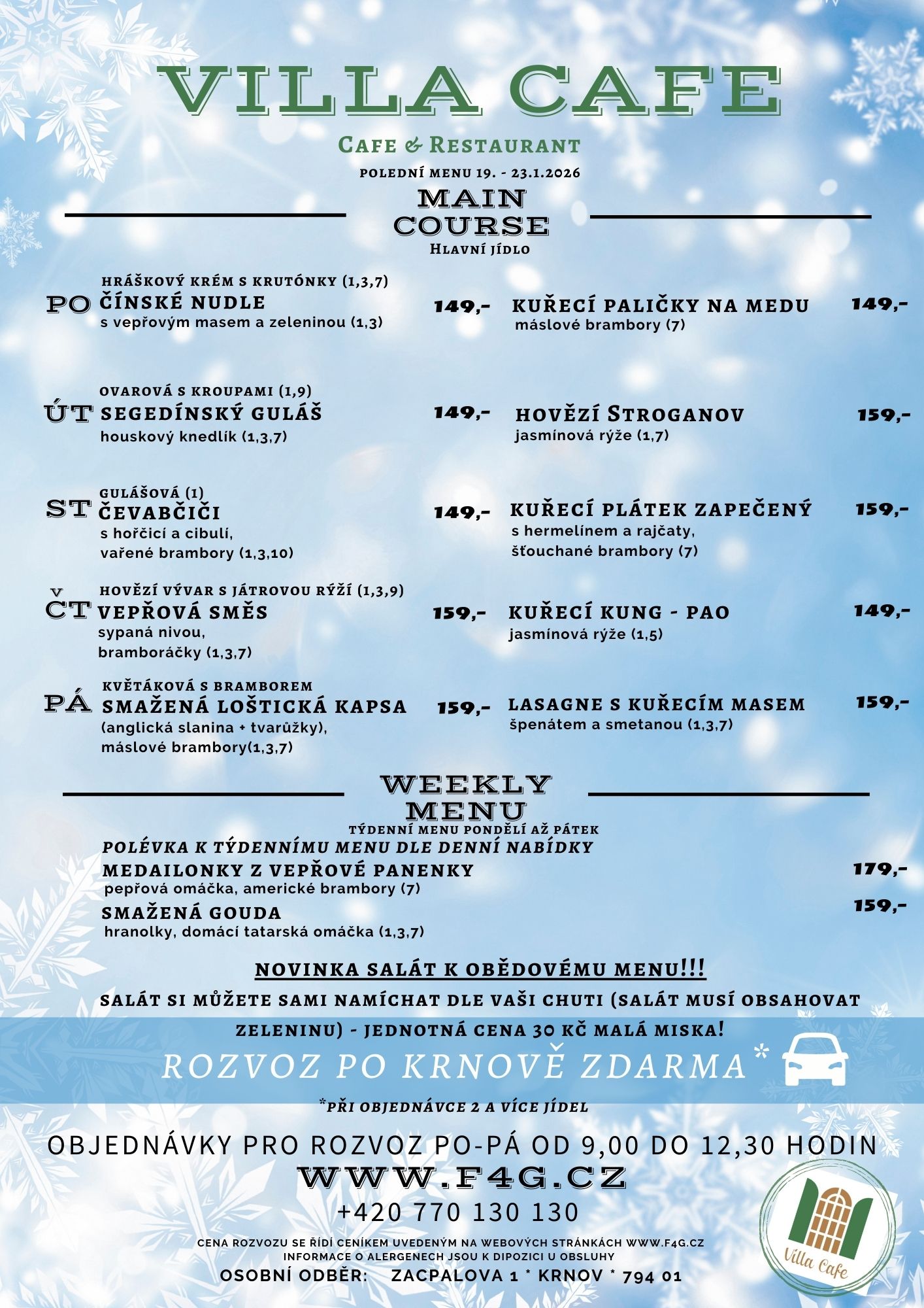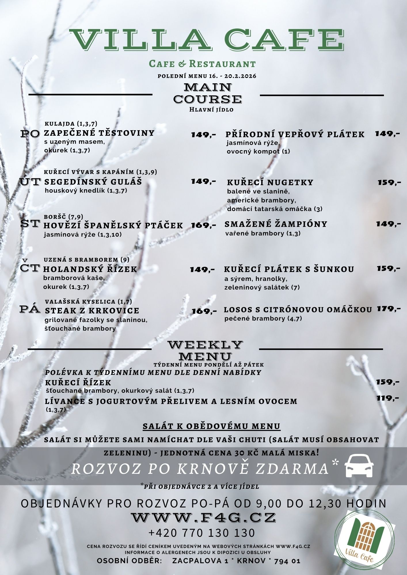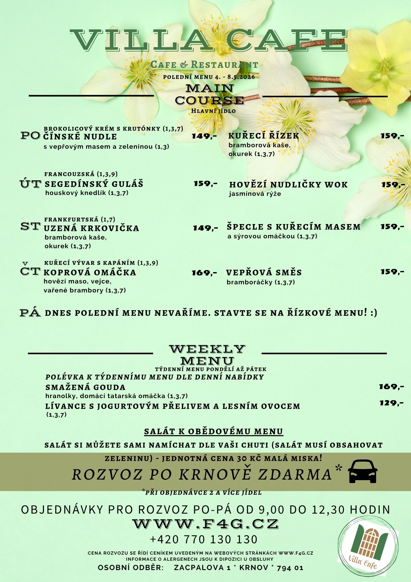 Vážení zákazníci, vítejte na stránkách F4G - Food for Go Krnov - nabízíme rozvoz poledního menu z vlastní restaurace Villa Cafe v Krnově na Zacpalově ulici.