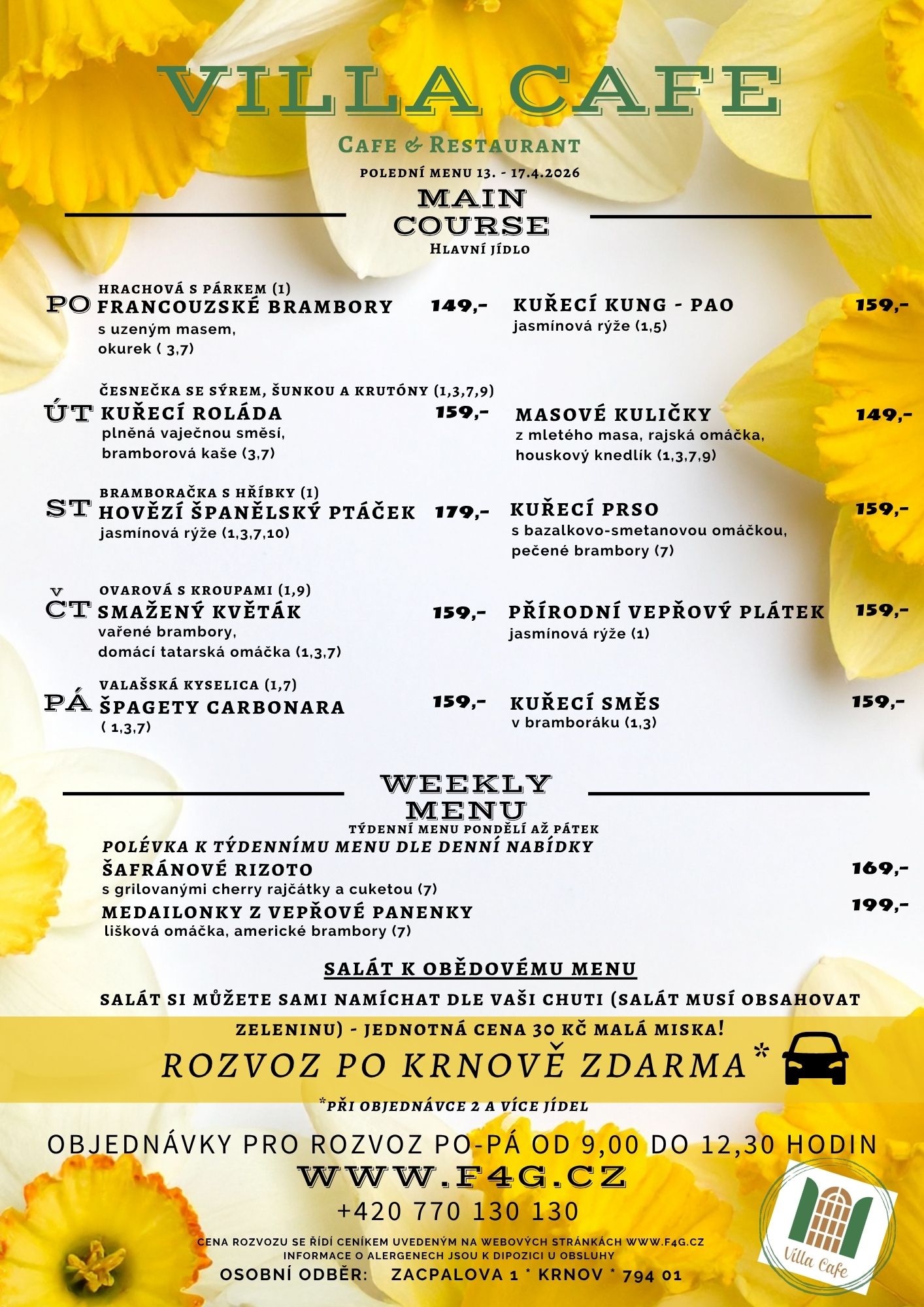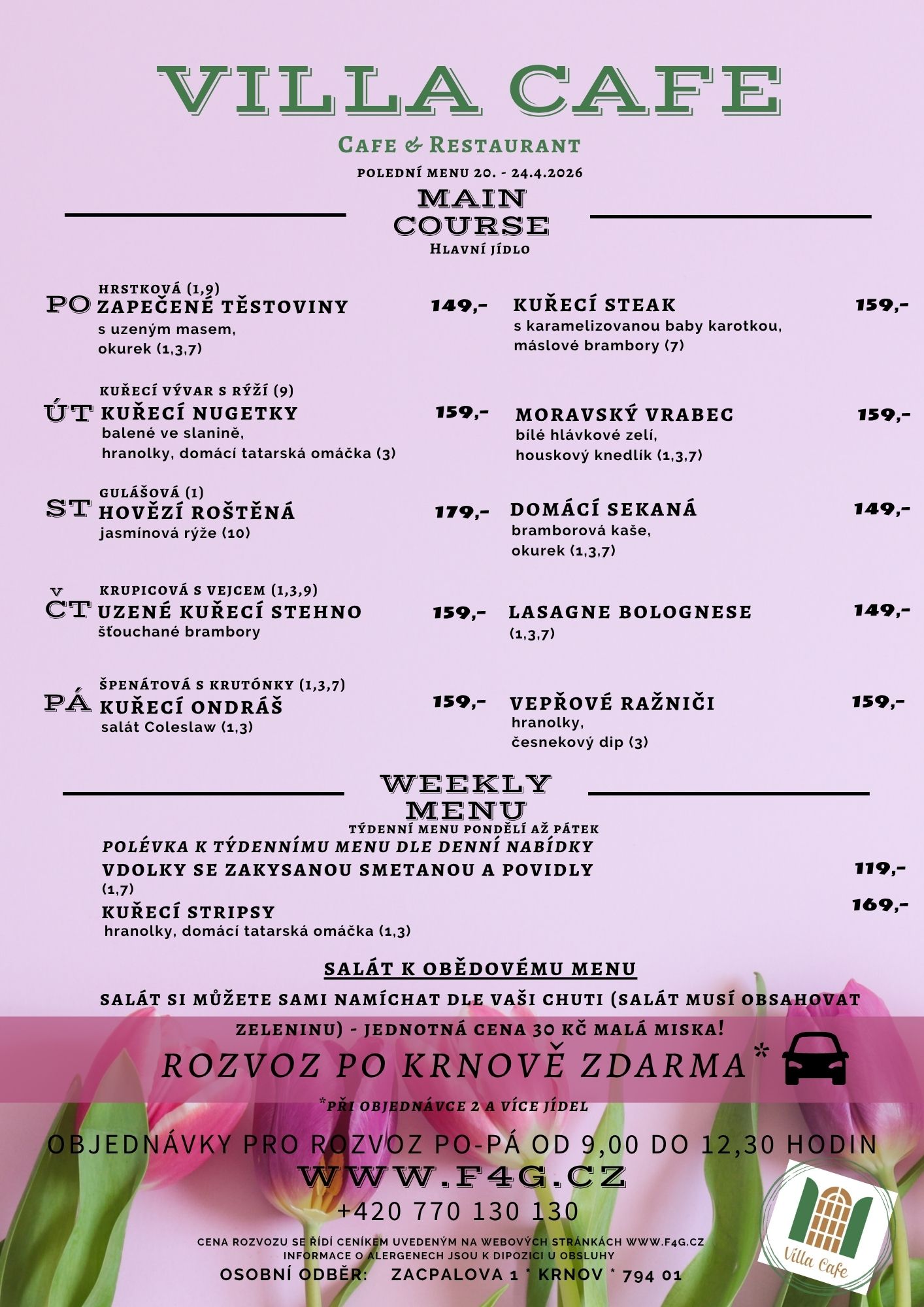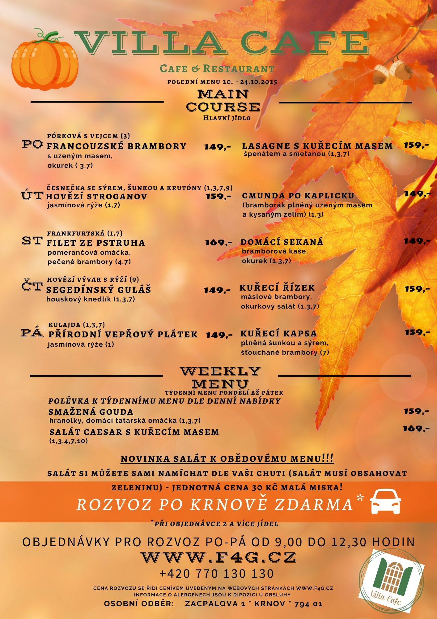 Vážení zákazníci, vítejte na stránkách F4G - Food for Go Krnov - nabízíme rozvoz poledního menu z vlastní restaurace Villa Cafe v Krnově na Zacpalově ulici.