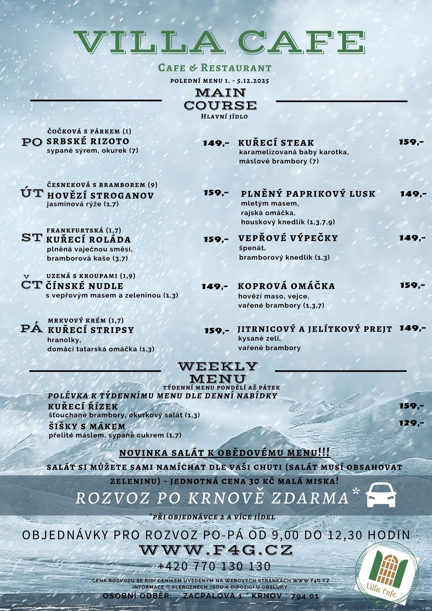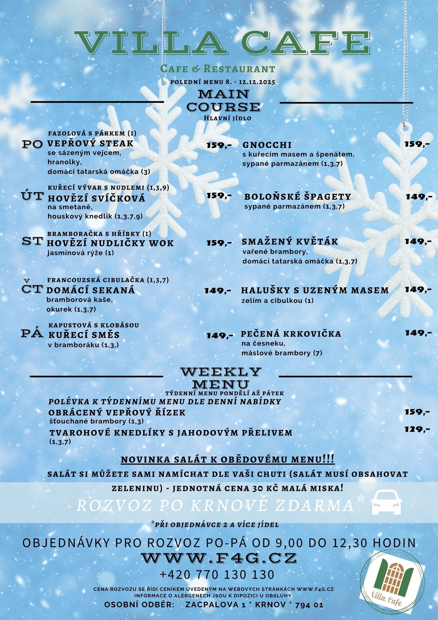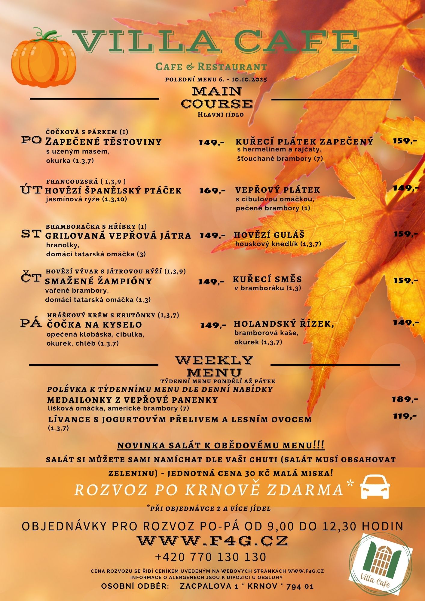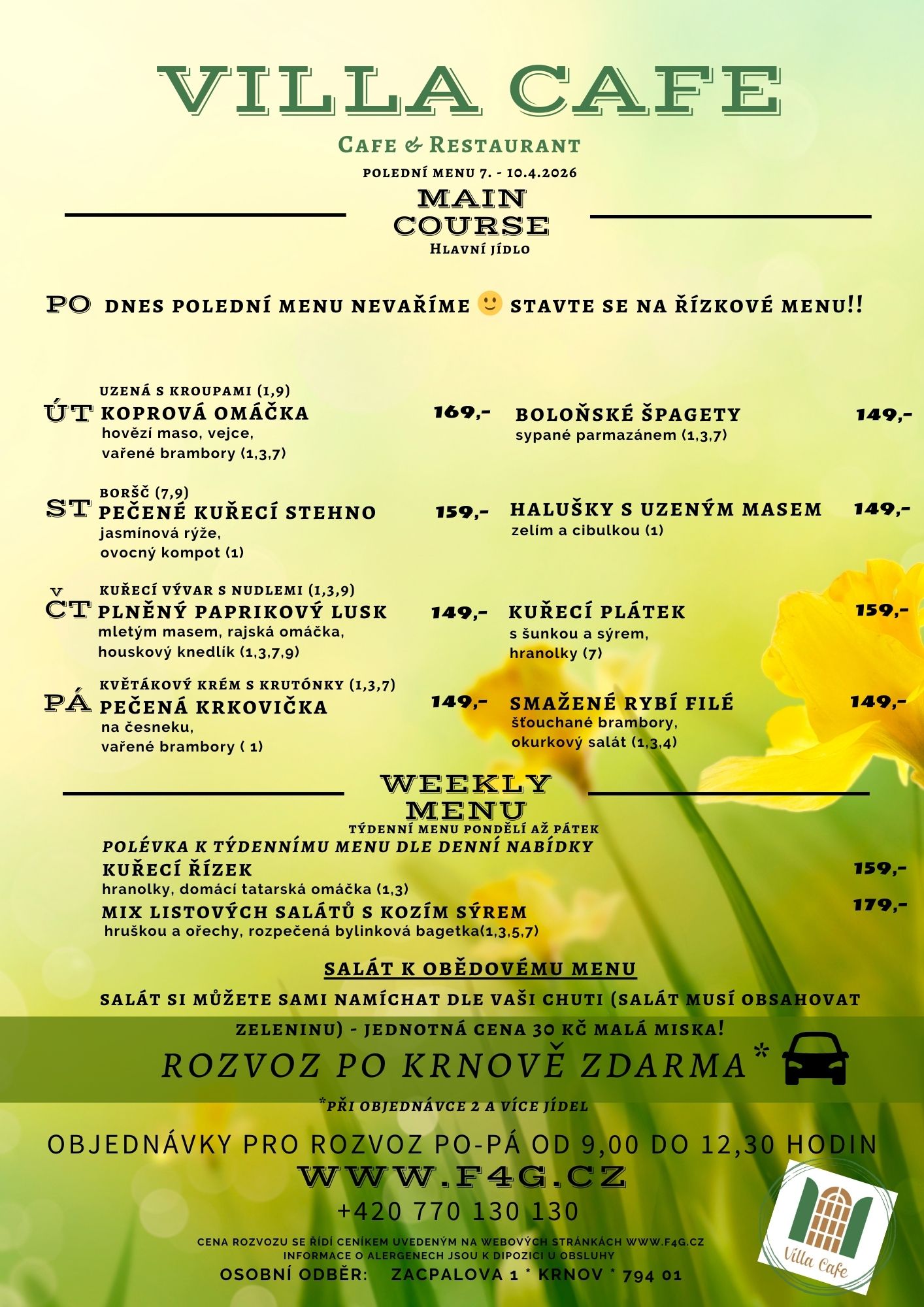 Vážení zákazníci, vítejte na stránkách F4G - Food for Go Krnov - nabízíme rozvoz poledního menu z vlastní restaurace Villa Cafe v Krnově na Zacpalově ulici.