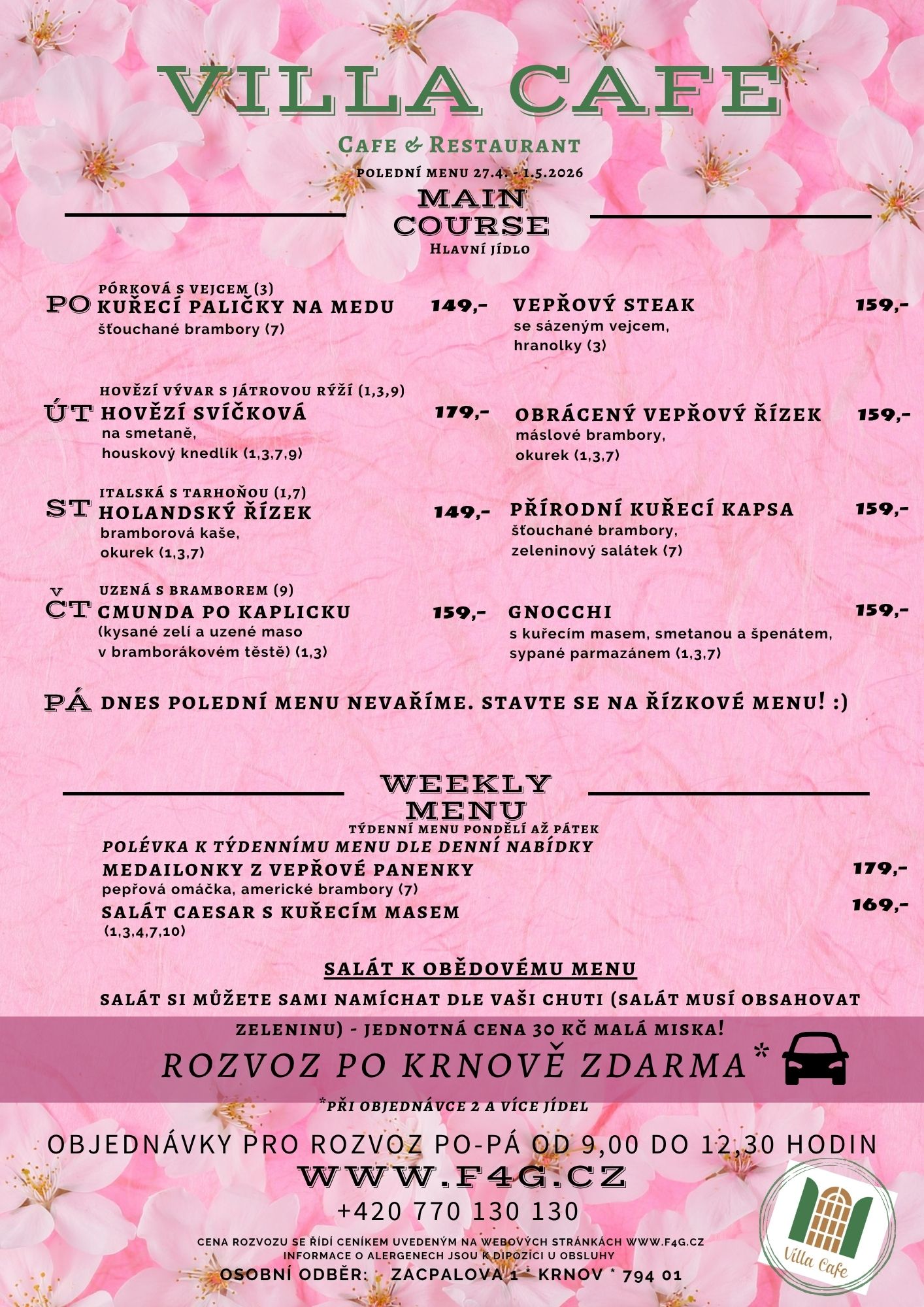 Při objednávce 2 a více jídel Vám po Krnově dovezeme meníčka zdarma. Navíc polévka je ke každému menu také zdarma.
