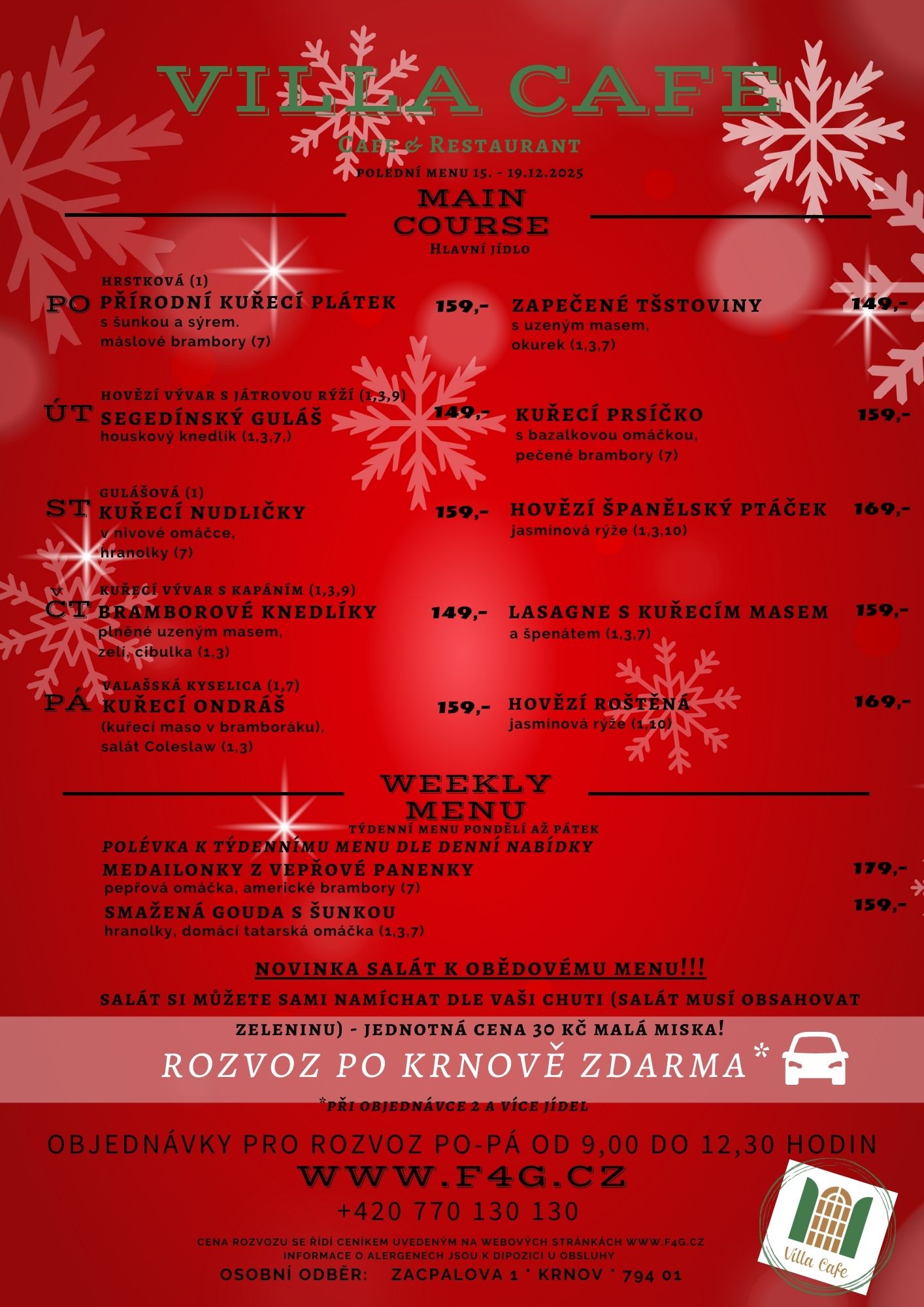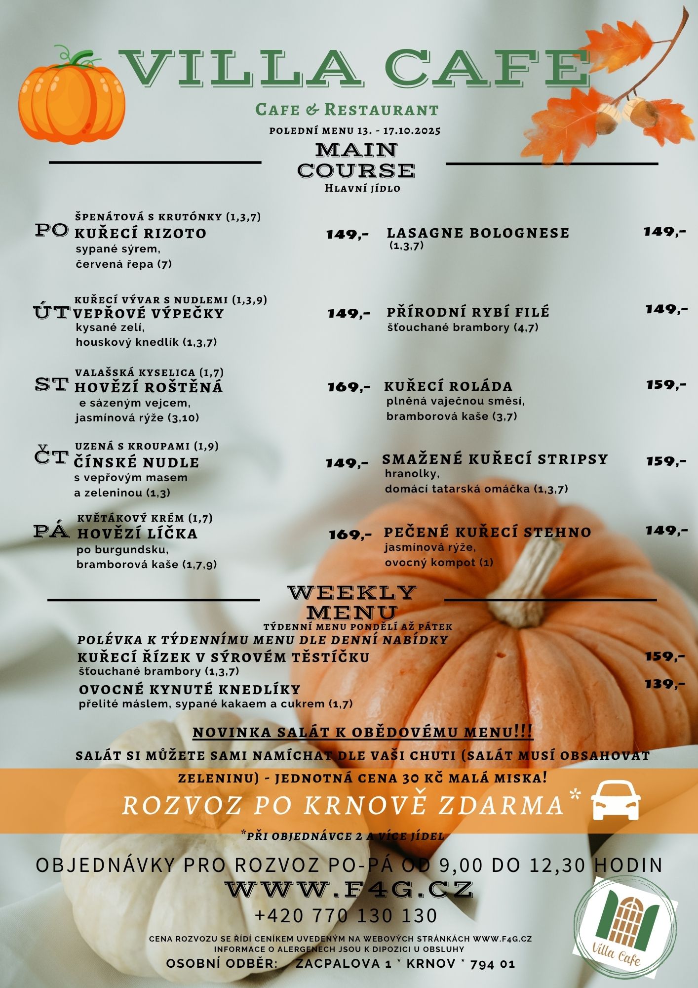 Vážení zákazníci, vítejte na stránkách F4G - Food for Go Krnov - nabízíme rozvoz poledního menu z vlastní restaurace Villa Cafe v Krnově na Zacpalově ulici.